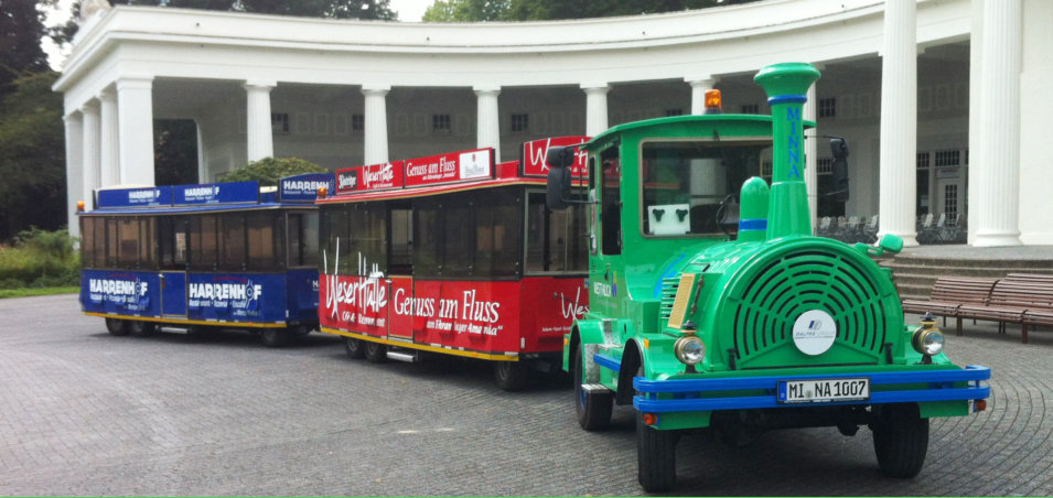 Sie planen eine Städtetour in die Kurstadt Bad Oeynhausen und wollen Ihren Kunden die zahlreichen Sehenswürdigkeiten nicht vorenthalten? Dann sind wir für Sie genau der richtige Partner! Wir „übernehmen“ Ihre Kunden (z.B. ab Parkstraße ) und entführen Sie für ca. 60-75 Minuten zu einer Stadtrundfahrt in Bad Oeynhausen. Zusätzlich besteht die Möglichkeit, im Café „Wandelbar“ neben der Wandelhalle direkt im Kurpark, „Kaffeetrinken“ für Ihre Reisegruppe dazu zu buchen. So genießen Sie unseren Rundum-Sorglos-Service. Sie brauchen sich vor Ort um nichts mehr zu kümmern und buchen zu einem günstigen Komplettpreis. Kurzfristige Buchung jederzeit möglich.Haben wir Ihr Interesse geweckt? Sie brauchen mehr Informationen? Dann rufen Sie uns an! Ihr Ansprechpartner Herr Jörg Gropp freut sich auf Ihren Anruf. Telefon: 05731 22525Mobil: 0163 9758105 E-Mail: info@stadtrundfahrten-badoeynhausen.de